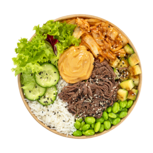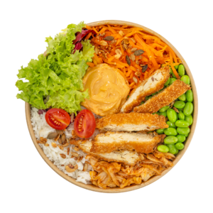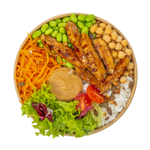 Grilované kuřecí proužky, rýže basmati, poke omáčka, nakládaná mrkev, edamame, nízkosacharidová salátová směs, cizrna, teriyaki, pražená sezamová směs.