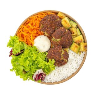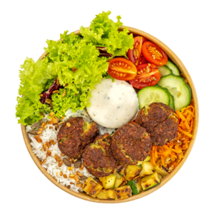 ![]() Falafel Balls, Basmati Rice, Mixed Salad, Pickled Carrot, Grilled Zucchini, And Tzatziki Dip. |