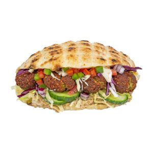 Placka nebo tortilla, lilková pomazánka, zelná směs, rajče, falafelové kuličky, tahini dresink, cibulové kostičky, nakládané okurky.