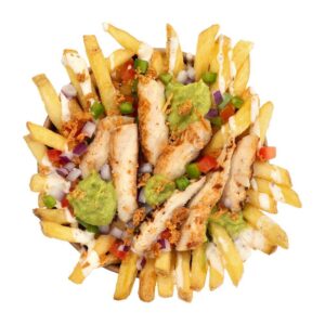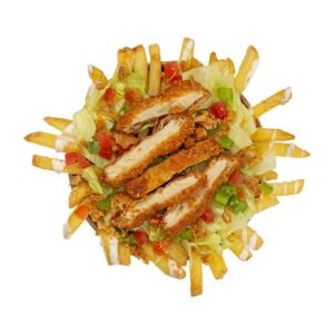 ![]() Pommes Frites, Grilled 100% Chicken Breast Strips, Pico De Gallo, Onion Cubes, Crunchy Onion, Avocado Salsa, And Ranch Dressing. |