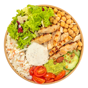 Grilované kuřecí proužky, rýže basmati, quinoa, poke omáčka, cherry rajče, coleslaw, nízkosacharidová salátová směs, cizrna (slanutak), guacamole, parmezán, jogurtový dresink, směs ořechů.