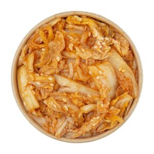 Kuřecí nuggets, kimchi, míchaný salát, edamame, rýže basmati, rýžová marináda, nakládaná mrkev, okurka, cherry rajče, pražená směs ořechů, kimchi majonézový dresink.