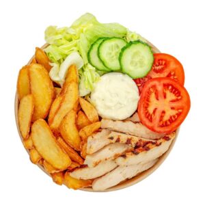 ![]() Grilled 100% Pork Strips, Flatbread, Iceberg, Cabbage Mix Salad, Tzatziki Dip, And Pommes Frites. |