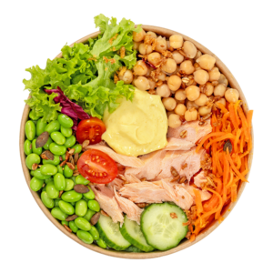 Grilované kuřecí proužky, rýže basmati, poke omáčka, nakládaná mrkev, edamame, nízkosacharidová salátová směs, cizrna, teriyaki, pražená sezamová směs.